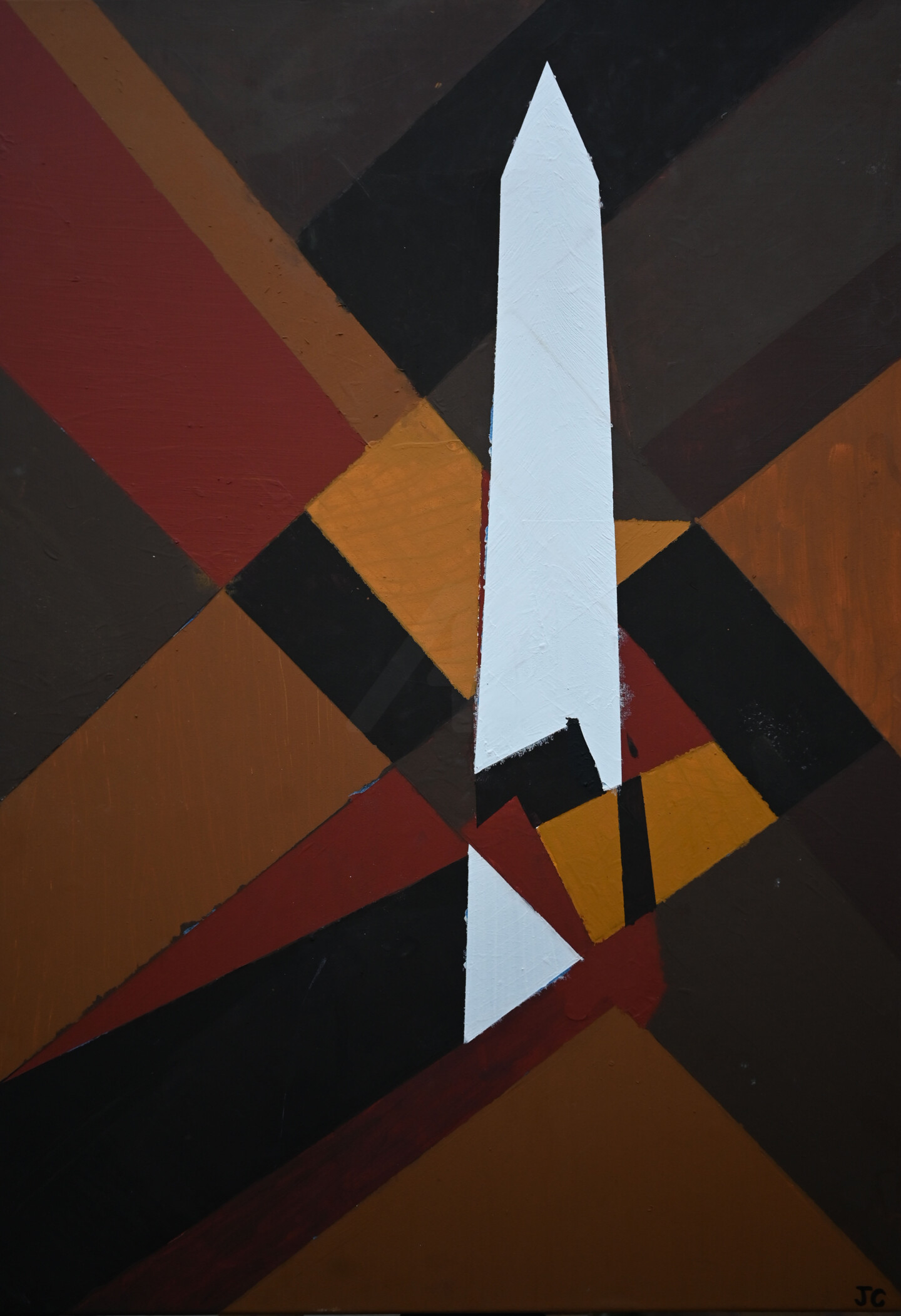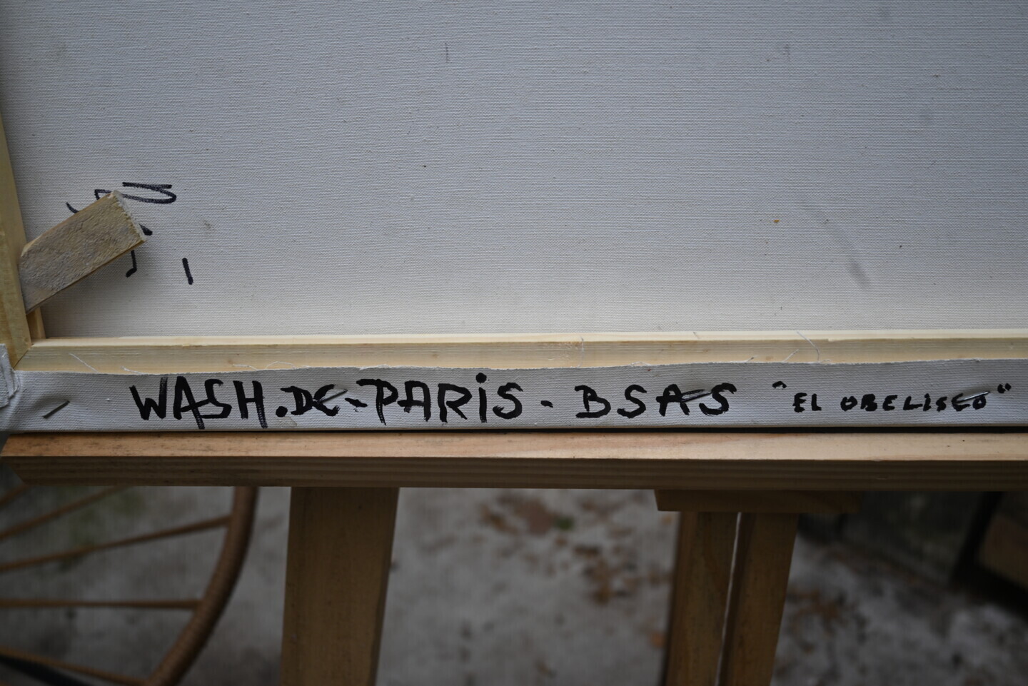 El lenguaje es geométrico, duro, sin concesiones: una arquitectura fracturada que evoca simultáneamente calles, sombras, perspectivas desplazadas y memorias urbanas. Cada plano parece empujar al siguiente, como si la ciudad —Buenos Aires— intentara reorganizarse alrededor de su símbolo más icónico.